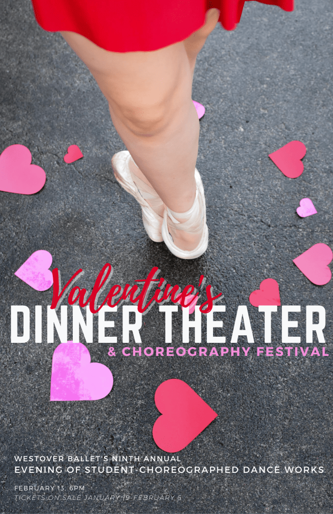 Our annual Valentine’s Dinner Theater and Choreography Festival is coming up, and this year it falls on February 13th – the day before Valentine’s Day!
