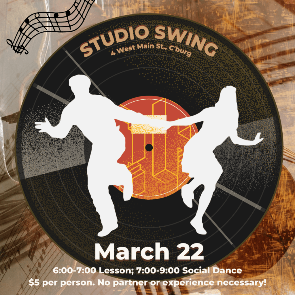 - Spring Social Dance Party – Friday, March 22nd – lesson 6:00-7:00pm, social dance 7:00-9:00pm. We’ll play a mix of fast and slow songs, so you’ll be able to practice your Charleston and your Lindy Hop!